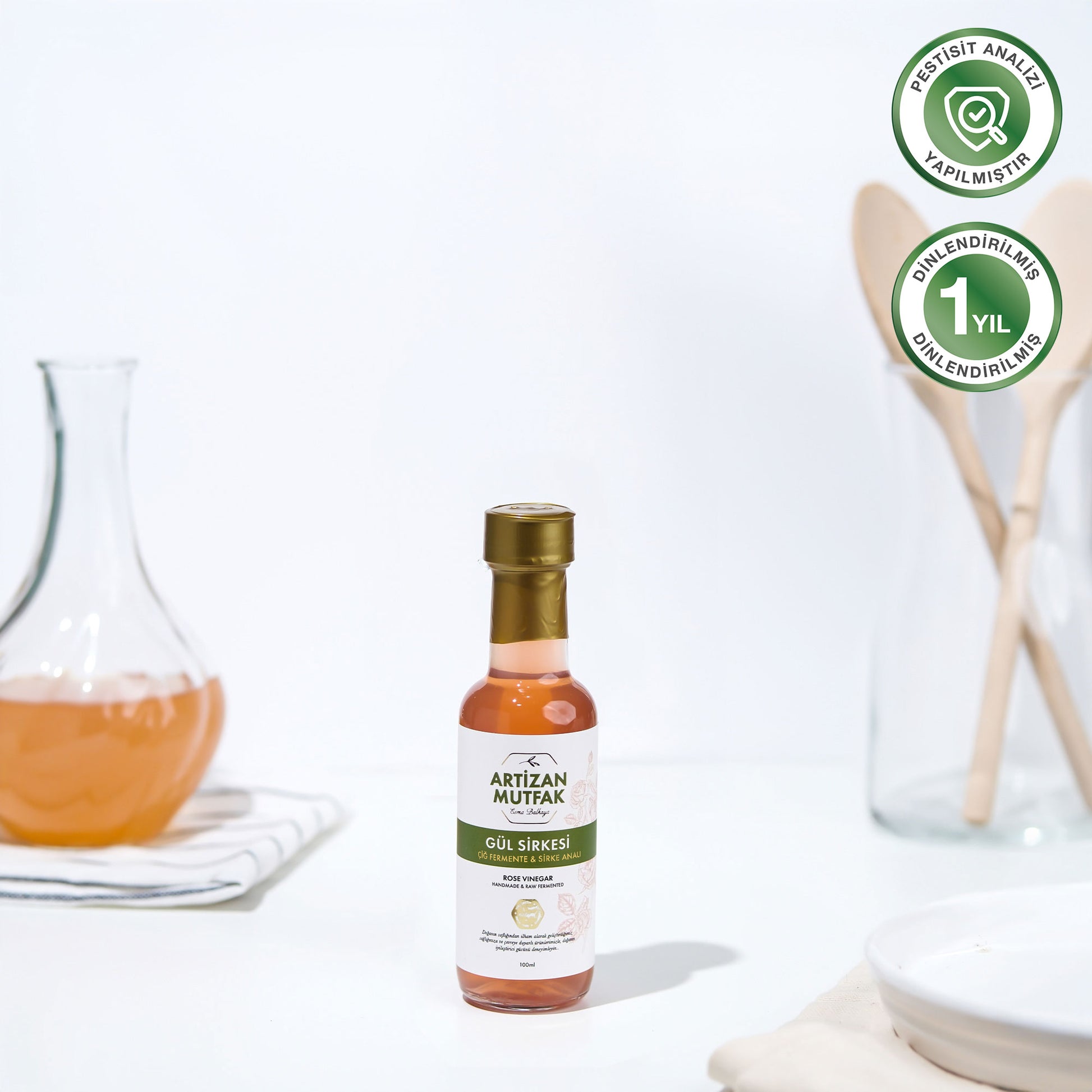 El yapımı, doğal fermantasyon süreci ile hazırlanmış Gül sirkesi. Organik bal ile meşe fıçılarda üretilmiştir. Seçiminize bağlı olarak 100ml ve 500ml olarak gönderilir.