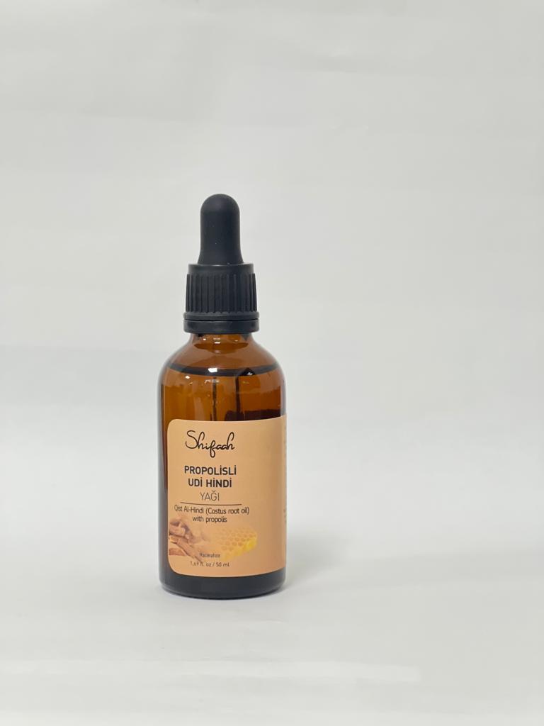 Propolisli Ud-i Hindi yağı, ud-i hindi yağının içine propolis (arılar tarafından üretilen ve doğal bir koruyucu madde olan reçineli bir madde) eklenerek zenginleştirilmiş bir formdur. Propolis, antibakteriyel ve antioksidan özellikleri ile bilinir. Bu kombinasyon, hem ud-i hindi yağının hem de propolisin faydalarını bir araya getirerek sağlık üzerinde olumlu etkiler sağlar.